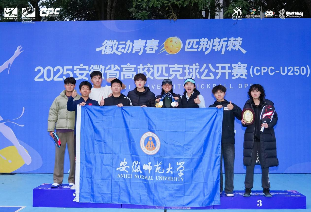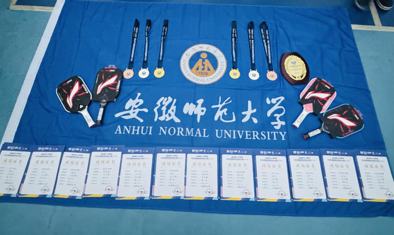 在此次强校云集、竞争白热化的首届赛事中,由岳建军老师带队、孙永梅老师担任教练的安徽师范大学匹克球代表队,展现出了超凡的毅力与卓越的竞技水平。队员们克服赛程密集、连续作战等多重考验,一路过关斩将,边打边学,最终从众多高校中成功脱颖而出,斩获一金一银一铜及团体第五名的战绩,实现了惊艳的省赛首秀,为学校赢得了崇高荣誉!具体获奖情况如下:
