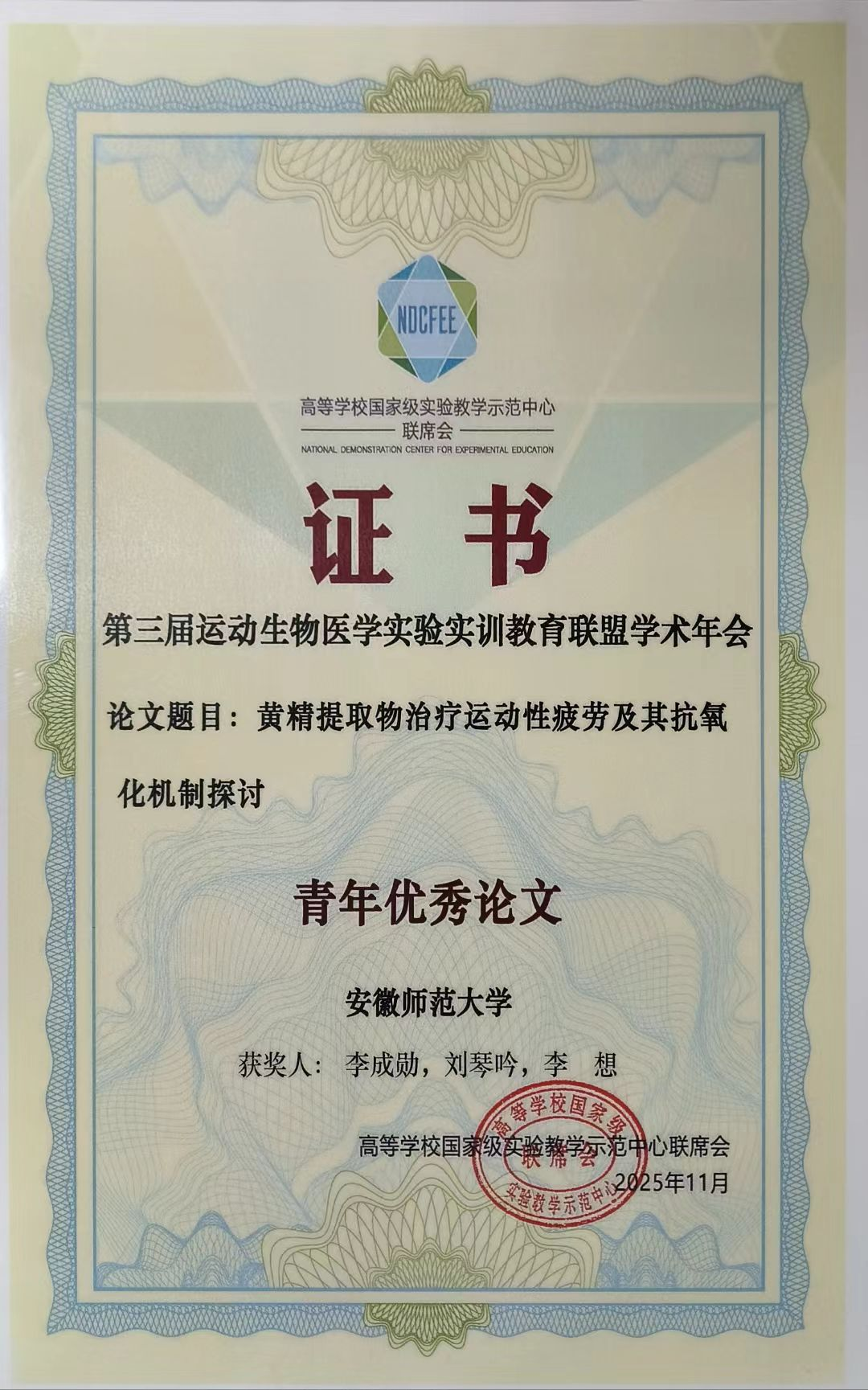2023级运动训练专业胡浩楠同学在绘图大赛中荣获全国二等奖(全国设一等奖5名,二等奖9名,三等奖14名)。2023级舞蹈表演专业李成勋同学在实验技能比赛中荣获全国三等奖(全国设一等奖3名,二等奖6名,三等奖12名),其参赛论文《黄精提取物治疗运动性疲劳及其抗氧化机制探讨》同时获评“青年优秀论文”。
