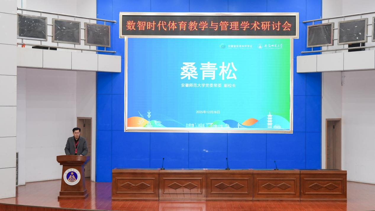 12月28日上午,“数智时代体育教学与管理学术研讨会”同步召开。开幕式在敬文图书馆报告厅举行,安徽师范大学党委常委、副校长桑青松致欢迎辞,向与会专家表示衷心感谢,并介绍了学校及体育学院的发展成就。他强调,数智技术正深刻改变体育教育形态与管理模式,期待研讨会汇聚智慧、探索新路。