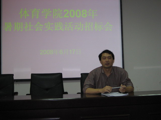 随着暑期的临近,暑期社会实践前期准备工作也进入了高潮。一年一度的暑期社会实践活动即将开始,体育学院的暑期社会实践招标、竞标活动也开展的有声有色。6月17日下午,院团委特于院行政楼会议室召开了2008年暑期社会实践活动招标会。担任招标会评委的领导有院党委副书记钟晨,院团委书记黄德春以及各年级辅导员,来自体育学院数十支竞标队伍参加了此次会议。