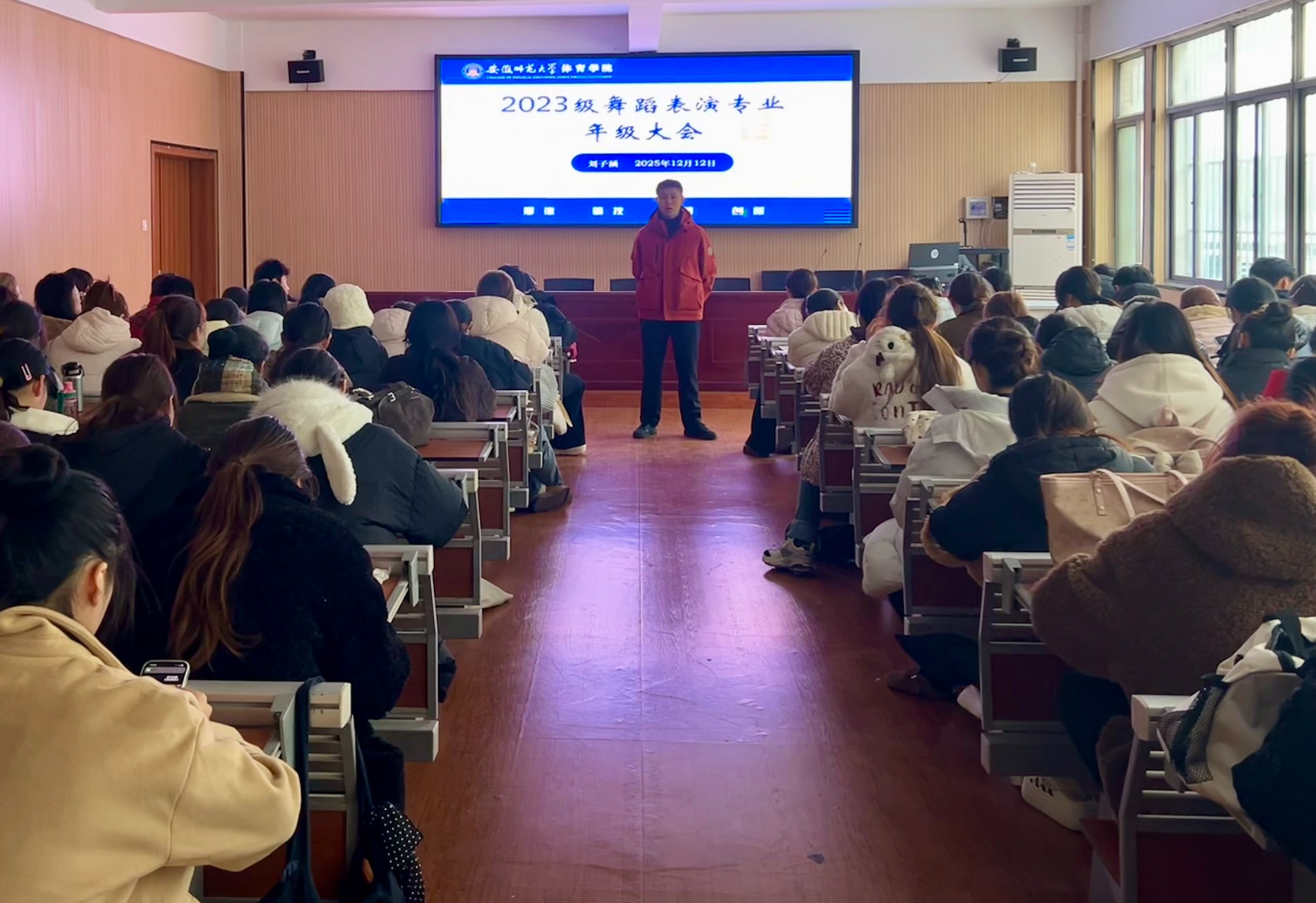 2025年12月12日,体育学院2023级舞蹈表演专业在北田径场多媒体教室以“切实提升师生法治素养,筑牢校园法治安全防线”为主题召开年级大会,会议由辅导员刘子涵主持,年级全体学生参与。