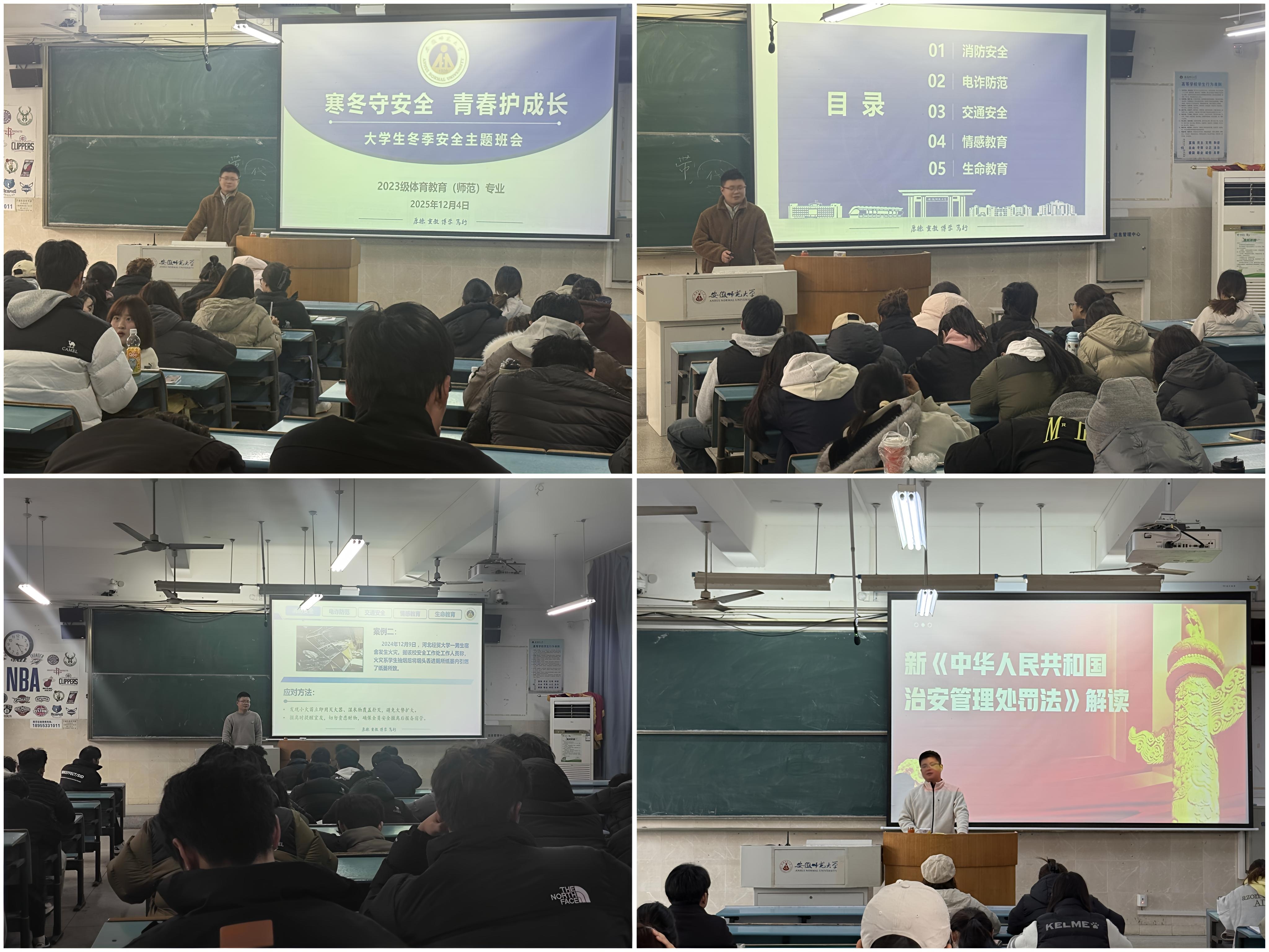 近期,为深入推进大学生护航行动计划,切实增强大学生安全意识,2023级体育教育(师范)专业召开了冬季安全主题班会。此次班会由辅导员汪冬生主持。