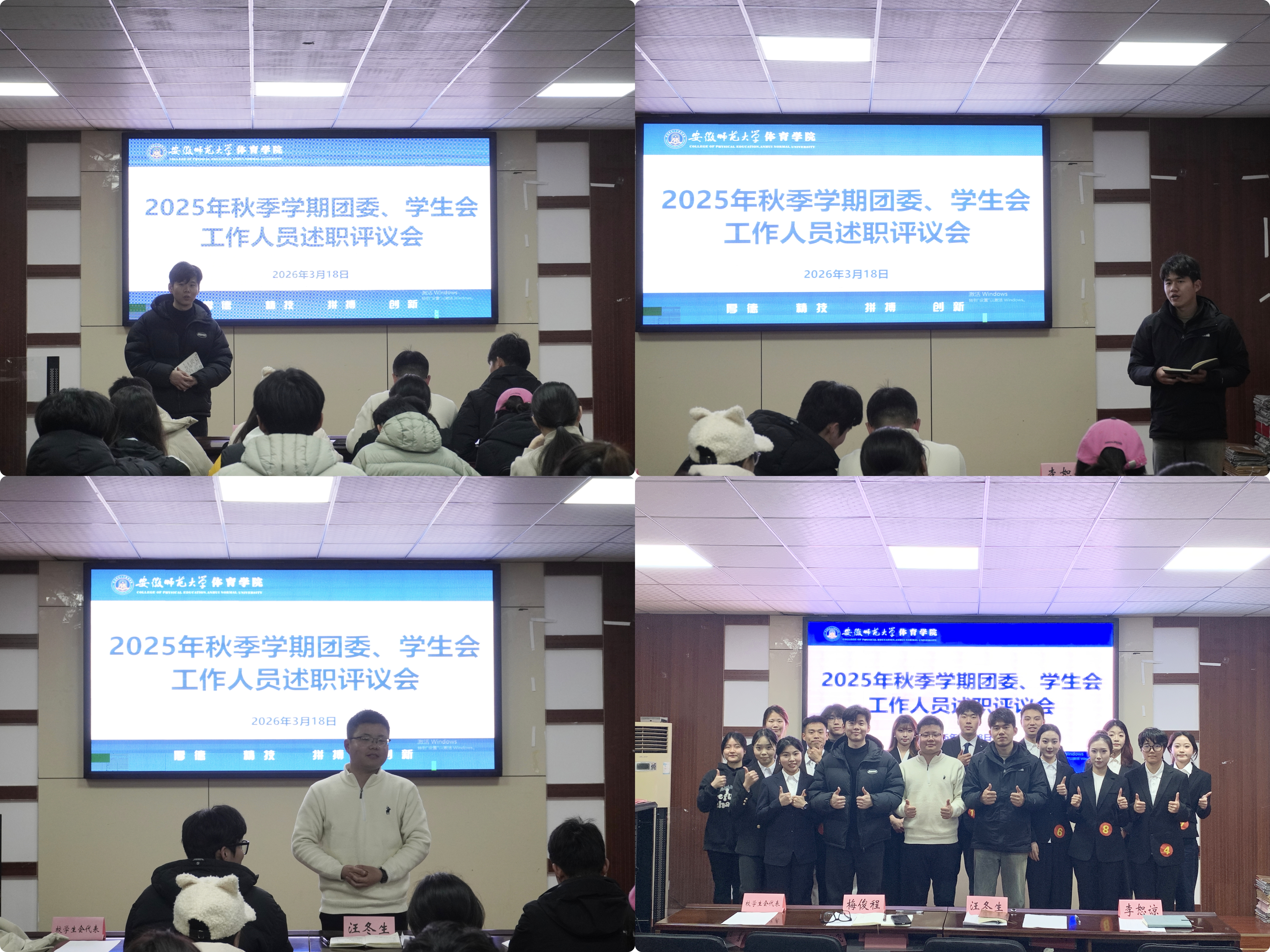 为全面总结2025年秋季学期学生会工作,加强学生会组织建设,2026年3月18日,体育学院学生会开展2025-2026学年第一学期述职评议会。学院团委书记汪冬生,副书记梅俊程、李恕谅出席会议,校学生会代表、院学生会全体工作人员、各班班长和学生代表参加会议,会议由院学生会工作人员钱一主持。
