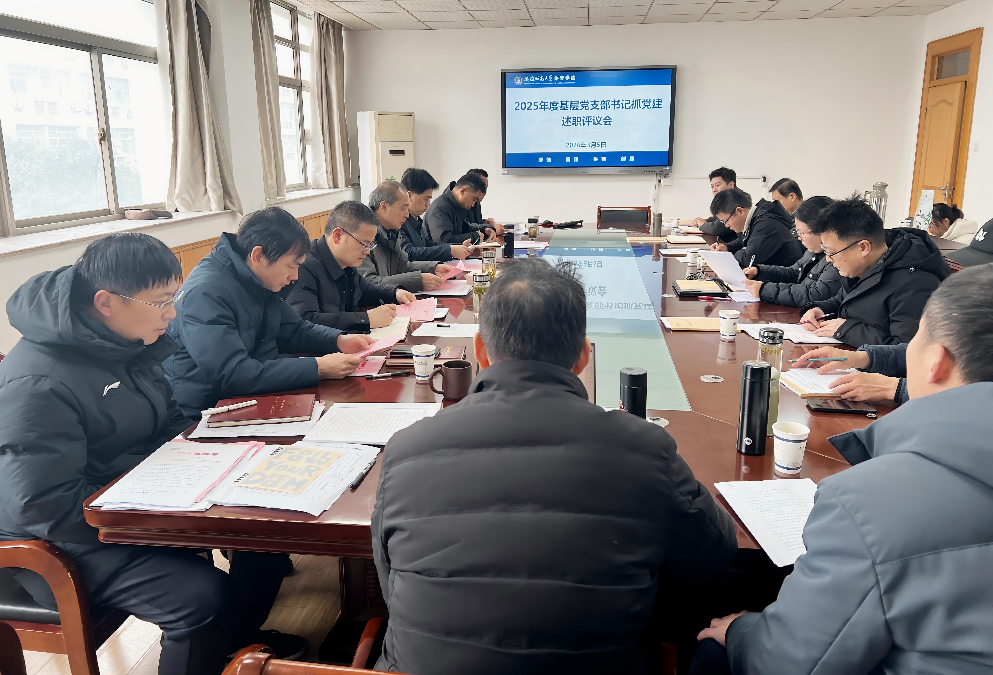 3月5日上午,体育学院在学院三楼会议室召开2025年度党支部书记抓党建述职评议会议。学院党委委员、全体党支部书记及师生代表参加会议,会议由院党委书记黄德春主持。