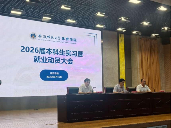 为切实做好 2022 级学生实习与就业衔接工作,明确实习任务要求,帮助学生以更清晰的目标和更充分的准备投入实习阶段,9 月 10 日下午 16:30,体育学院 2025 年实习暨就业动员大会在理科大楼报告厅隆重召开。学院领导、各专业负责人、各实习指导老师、全体辅导员及 2022 级全体学生参会,会议由学院副院长岳建军主持。