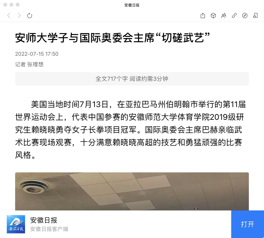 美国当地时间7月13日,在亚拉巴马州伯明翰市举行的第11届世界运动会上,代表中国参赛的安徽师范大学体育学院2019级研究生赖晓晓勇夺女子长拳项目冠军。国际奥委会主席巴赫亲临武术比赛现场观赛,十分满意赖晓晓高超的技艺和勇猛顽强的比赛风格。
