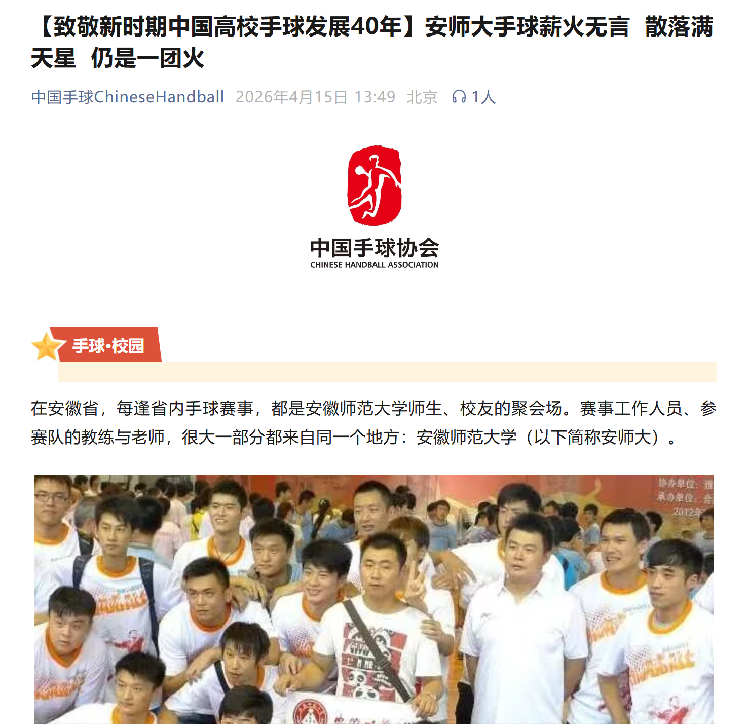 把根扎在江淮大地上。如今的安师大手球,在几任老师的接力传承中,早已枝繁叶茂。那些从校园走出去的学子,有的成了地方体校的教练,有的成了中小学的体育老师。每当省内赛事打响,他们从四面八方赶来,身份变了,但身上的那件“安师大”底色没变。赛场是老友重逢,是师徒相见,但更是展示坚韧不拔的竞技精神的战场。而那些在校园手球场上奔跑的娃娃,青训手球场地里挥洒汗水的小运动员,则通过他们的教练、老师的身体力行,继续书写着安师大手球的坚韧与传承。二十六年,足够一个孩子从出生走到大学毕业。二十六年,安师大手球用一场接一场的接力,把对手球运动的热爱、把对手球运动富含的坚韧不拔、把对推广手球运动的深厚情怀,这个根深深扎进了江淮大地。聚是一团火,散作满天星。这,就是安师大手球的信仰。