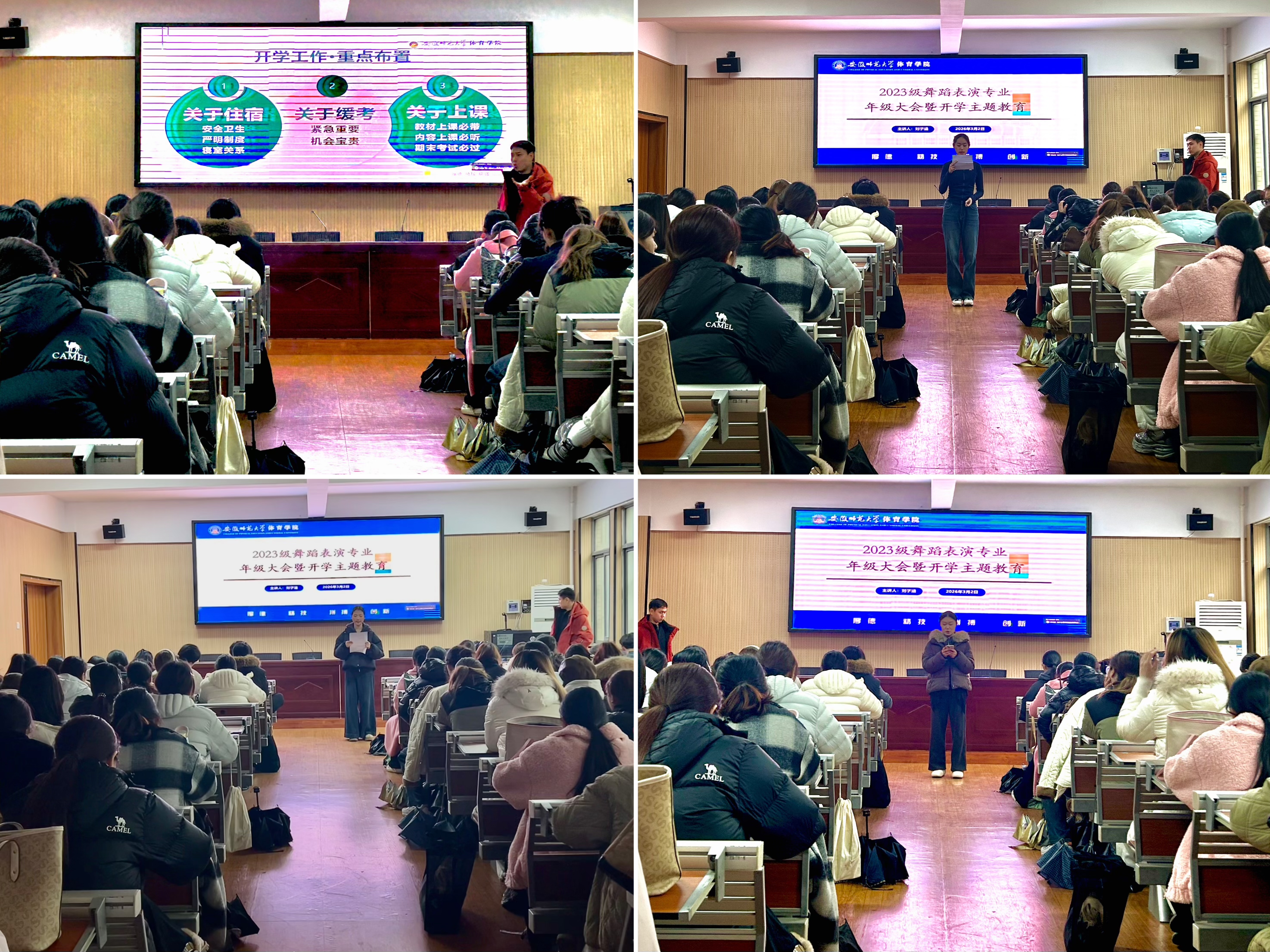 2026年3月2日,体育学院2023级舞蹈表演专业全体师生在北田径场多媒体教室召开第六学期年级大会,全面总结上学期工作,部署新学期重点任务,会议由辅导员刘子涵主持。